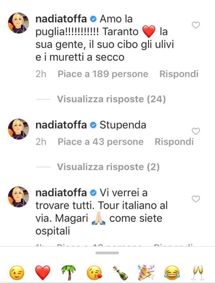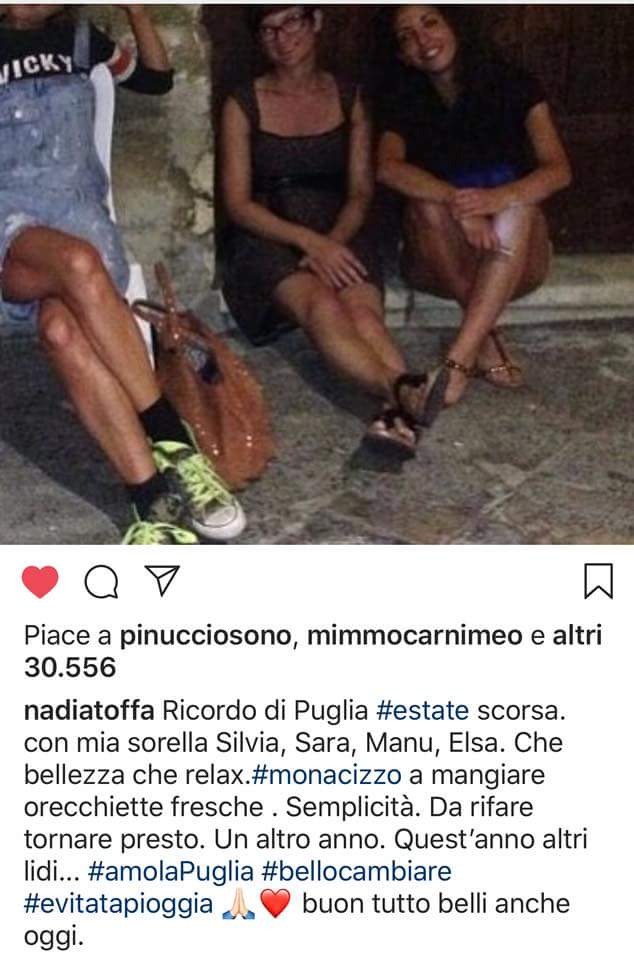 Nadia Toffa conferma il suo feeling con la provincia di Taranto e trascorre qualche giorno di vacanza a Monacizzo.