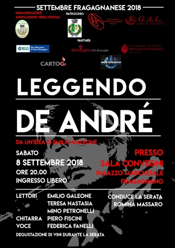 Il centro storico di Fragagnano si appresta ad ospitare l’evento tributo al grande e indiscusso Faber e alla poesia d’autore.”Una notte con ... un tributo declamato e non cantato, Leggendo De André”, tratto da un’idea di Emilio Galeone.
