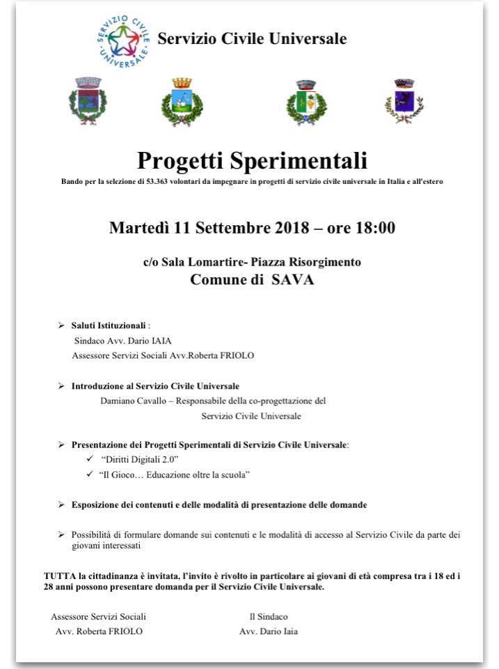 Seguirà l’esposizione dei contenuti e delle modalità di presentazione delle domande da parte di chi è interessato ad aderire all’iniziativa. L’Amministrazione comunale di Sava informa, altresì, che vi sarà la possibilità di formulare domande sui contenuti e sulle modalità di accesso al Servizio Civile da parte dei giovani interessati, di età compresa fra 18 e 28 anni, requisito necessario per aderire all’iniziativa.