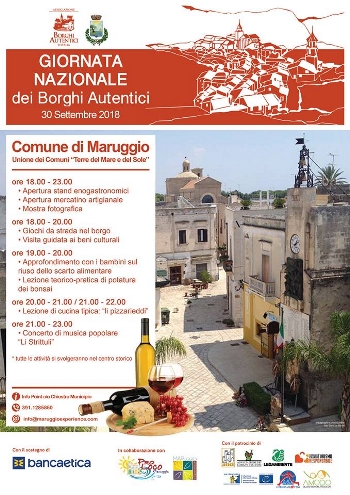 «Il progetto proposto da “Borghi Autentici d’Italia” (associazione di cui il nostro comune fa parte fa parte insieme agli altri componenti dell’ “Unione dei Comuni delle Terre del Mare e del sole” e curato insieme agli operatori di Maruggio Experience) è denominato “Cibo e vino di comunità”» afferma l’assessore al Turismo e allo Spettacolo, Tiziana Destratis. «L’evento, realizzato con la collaborazione della Pro Loco di Maruggio, trasformerà il centro storico in una fucina di “attività territoriali” e ospiterà stand enogastronomici ed artigianali, mostre fotografiche, giochi di strada e visite guidate e, secondo lo spirito dei Borghi Autentici, che pone al centro dell’interesse le esperienze, un laboratorio teorico-pratico destinato ai bambini e agli appassionati di bonsai».