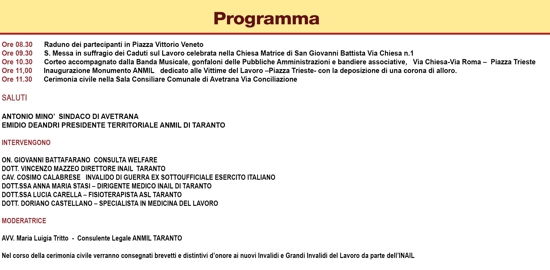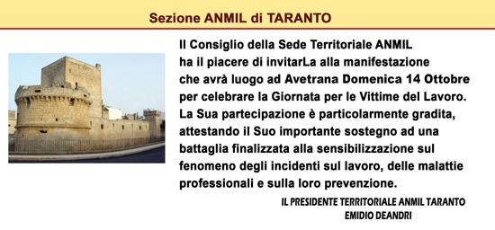 L’ANMIL (Associazione Nazionale fra Lavoratori ed Invalidi del Lavoro) di Taranto, celebrerà quest’anno ad Avetrana la 68ª Giornata Nazionale per le Vittime degli Incidenti sul Lavoro: si svolgerà nel Comune di Avetrana domenica 14 ottobre.