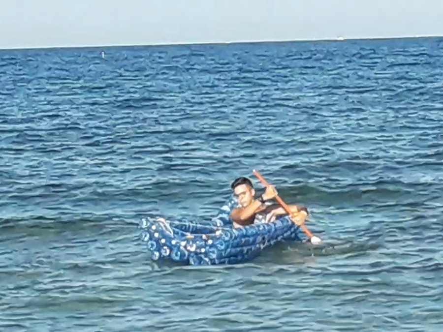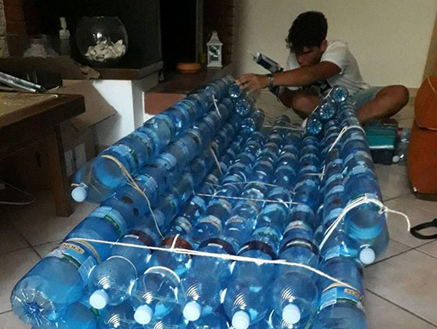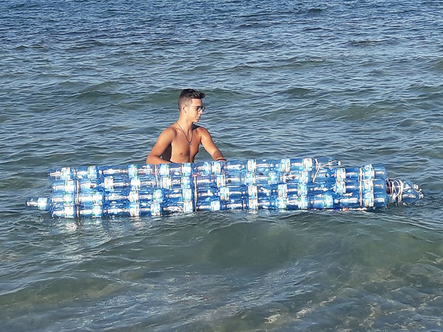 Ha pazientemente raccolto 150 bottiglie, ha ideato un modo per saldarle e legarle tra loro così da ottenere una forma assimilabile ad una canoa e, nei giorni scorsi, l’ha portata al mare e l’ha …varata. Non è andata nel migliore dei modi, l’imbarcazione ha retto solo una ventina di minuti, poi alcune saldature sulla parte inferiore del natante hanno iniziato a cedere e a non reggere più il peso del giovane inventore.