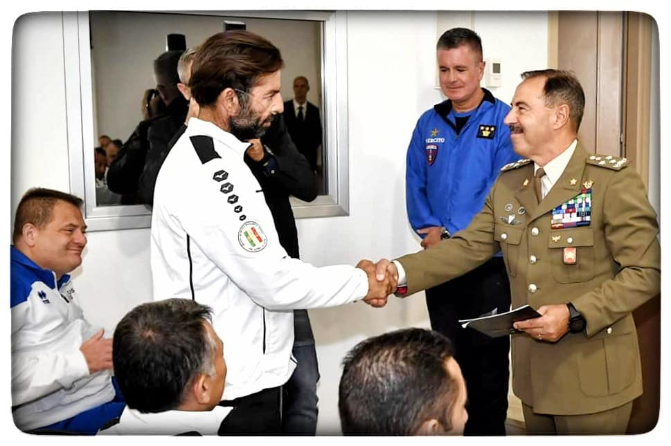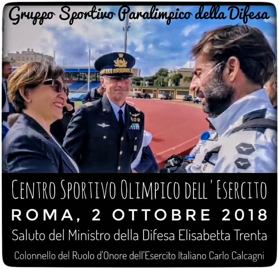 «Incontrare stamane il Ministro della Difesa Elisabetta Trenta e poter scambiare un affettuoso saluto è stato per me motivo di onore e stimolo a portare avanti con spirito di servizio il mio compito di militare e quella che è diventata ormai la mia missione con il mio motto “Mai arrendersi”: essere d’esempio ed un vero messaggio di vita per tutti» afferma il col. del Ruolo d’Onore Carlo Calcagni. «Continuare, pur in un altro ambito meno operativo di quando nel pieno delle mie funzioni pilotavo un elicottero, ma pur sempre di solidarietà e condivisione, ad onorare il nostro TRICOLORE e l’amata uniforme è e sarà sempre per me, che sento un forte senso di appartenenza alla Forza Armata ed al Gruppo Sportivo Paralimpico della Difesa, la ragione per cui riesco a lottare quotidianamente e guardare oltre la mia grave malattia.