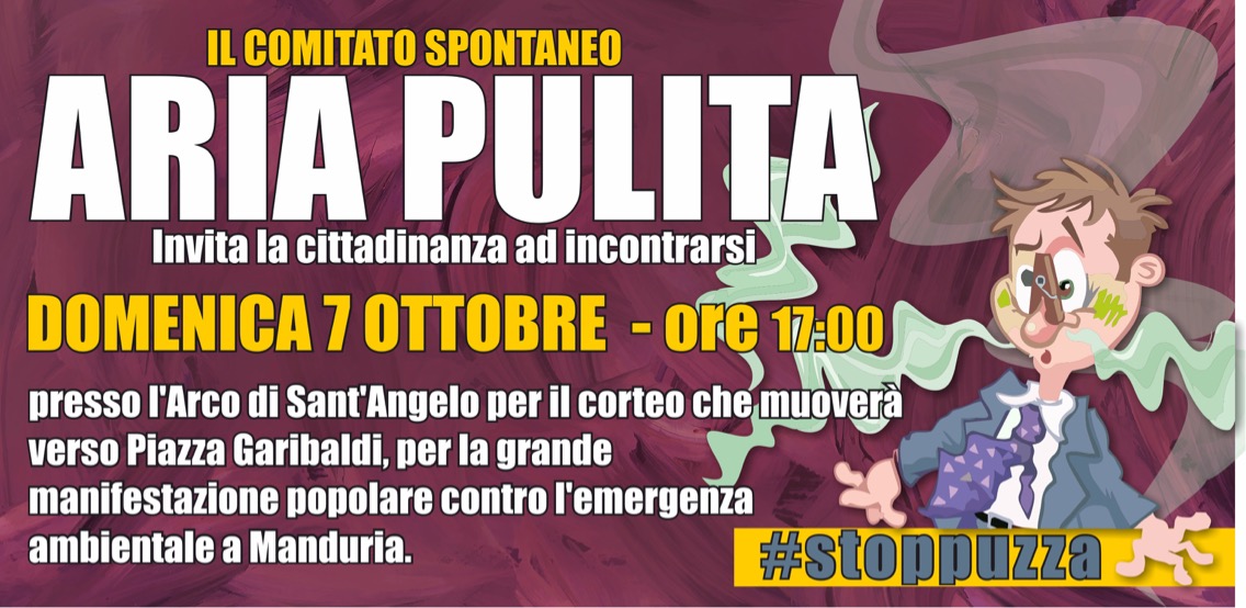«Si è svolta ieri l'ultima assemblea del Comitato “Aria Pulita” prima della manifestazione unitaria di domenica prossima 7 ottobre. Nel corso di essa è stata data lettura dell'esposizione alla Procura della Repubblica preparato dagli avvocati dell'Associazione Forense Messapica, in collaborazione con altri colleghi. In esso si sottolineano i disagi provocati dagli odori nauseabondi che ammorbano la Città, chiamando a testimoni tutti i cittadini di Manduria, e si chiede di intervenire per individuarne origine e composizione. L'esposto è stato sottoscritto da 33 associazioni, comitati, gruppi spontanei, partiti politici di ogni orientamento.