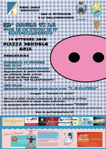 Tutto pronto in piazza Donnolo a Oria per la 32ª Edizione de “La sagra ti la sasizza” in programma domenica 14 ottobre con una giornata ricca di eventi che