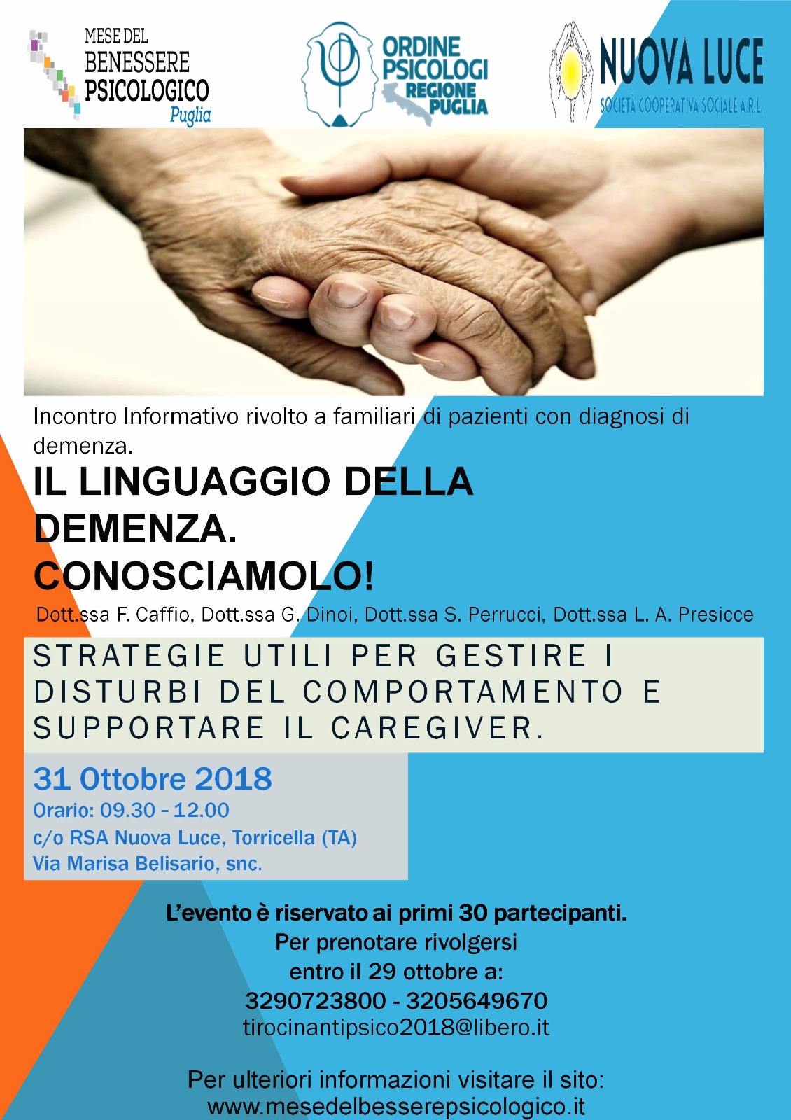 Psicologi Puglia, il 31 ottobre, presso la RSA Nuova Luce, sita in Via Marisa Belisario, Torricella, dalle ore 09:30 alle ore 12:00 si terrà un incontro informativo rivolto a familiari di pazienti con diagnosi di demenza.