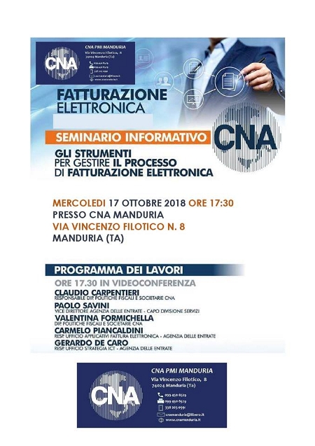 Questa sera, alle 17,30, CNA PMI Manduria sarà collegata in videoconferenza con CNA nazionale su una importante tematica che fa perdere il sonno ad artigiani, imprese e professionisti dal titolo: “Fatturazione elettronica, gli strumenti per gestire la fatturazione elettronica”.