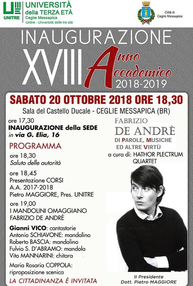 Lo fa con due concerti, sabato 20 e domenica 21 ottobre prossimi, uno nel Castello di Ceglie Messapica alle ore 19, per celebrare, a quasi 20 anni dalla morte, Fabrizio De Andrè e la sua opera, in un concerto che spazierà da “Il Bombarolo” a “Via del campo”, da “Il gorilla” a “Bocca di Rosa”, da “La canzone di Marinella” a “Don Raffae’”, per citarne solo alcuni, brani sottolineati dalle presentazioni della prof.ssa Erika Bascià.