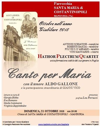 Domenica 21, invece, il gruppo sarà di scena a Manduria, nella Chiesa di Santa Maria di Costantinopoli alle ore 19.00, per un concerto mariano, a conferma anche della versatilità musicale dell’HPQ. Fortemente voluto dal parroco, don Teodoro Tripaldi, il concerto sarà affidato ai mandolini dell’HPQ e alla voce del tenore M° Aldo Gallone, con la partecipazione di Gianni Vico, oltre alle letture di Giorgia Bibba, Eva Romano, Giulia Sammarco, Virginia Zappimbulso e alla presentazione della prof.ssa Lea Perrucci.