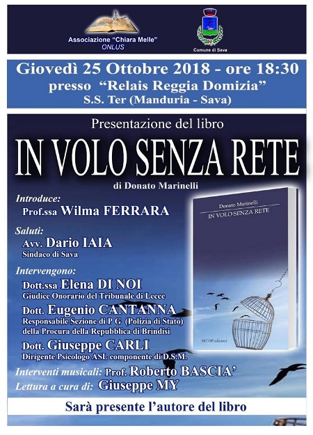 Il libro sarà presentato il 25 ottobre, presso Relais Reggia Domizia a Sava, a impreziosire l’evento ci sarà la prof.ssa Wilma Ferrara che modererà e coordinerà gli interventi degli illustrissimi relatori la dott.ssa Elena di Noi, giudice onorario del tribunale di Lecce, il dr. Eugenio Cantanna, responsabile Sezione di P.G.(Polizia di Stato) della procura della Repubblica di Brindisi, il Dr Giuseppe Carli, dirigente psicologo ASL e componente di DSM. Le musiche saranno curate dal prof. Roberto Bascià che accompagnerà le letture del dr. Giuseppe My. All’evento prenderanno parte autorità civili e militari e il sindaco Avv. Dario Iaia.