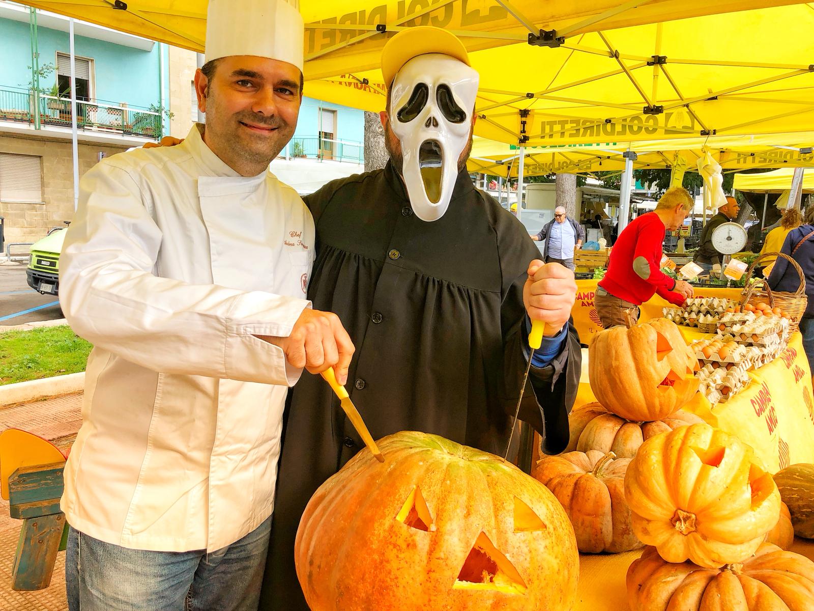 Zucche superstar al Mercato di Campagna Amica, ieri mattina, in piazza Ariosto, nel cuore di Lecce. Ospite speciale della Festa di Halloween a Km zero, l'agrichef Andrea Serravezza che ha spiegato come preparare ghiotte crostate alla zucca, zuppe d’autunno e altre bontà (le ricette nel dettaglio saranno pubblicate sulla pagina Facebook Campagna Amica Lecce). “Un ingrediente umile ma versatile che può rivelarsi un vero gioiello in cucina”, ha detto Serravezza. Tortelli, gnocchi, dolci e pane, minestre e minestroni: sono infinite le ricette arricchite dall'ortaggio arancione. Una allegra Festa di Halloween con i coltivatori diretti salentini che hanno offerto dolcetti stregati e altre bontà color arancio, alla presenza anche dell’assessore ai rapporti con i quartieri del Comune di Lecce, Sergio Signore e della presidente del Consiglio comunale, Paola Povero. E poi scherzetti paurosi con le zucche intagliate a mo' di mostri. “Un modo per valorizzare un prodotto di stagione che vanta un'antica tradizione nelle campagna salentine e che può diventare sempre più protagonista dei menu invernali”, il commento del presidente di Coldiretti Lecce, Gianni Cantele. “Prodotti coltivati nelle campagne di Lecce che arrivano direttamente sulla tavola dei consumatori con tutta la loro freschezza e genuinità”, aggiunge il direttore di Coldiretti Lecce, Giuseppe Brillante.