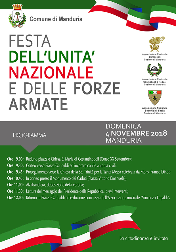 Come di consuetudine, ogni anno l’Associazione Nazionale Bersaglieri, sezione di Manduria “E. Toti” organizza a Manduria la cerimonia della Festa Dell'Unità Nazionale e delle Forze Armate il 4 Novembre 2018.