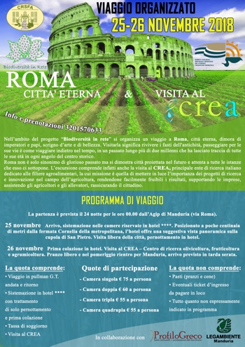 Coerentemente alla mission suddetta, le Riserve Naturali del Litorale Tarantino, coadiuvate dalle associazioni Circolo Legambiente Manduria e Profilo Greco, aprono gli obiettivi del progetto a tutti, organizzando, per il 25 e 26 novembre p.v., una visita a Roma al CREA, uno dei Partner del progetto e principale ente di ricerca in agricoltura a livello nazionale: due giorni tra riscoperta della bellezza tramandata e ricerca di un nuovo patrimonio da lasciare in eredità.
