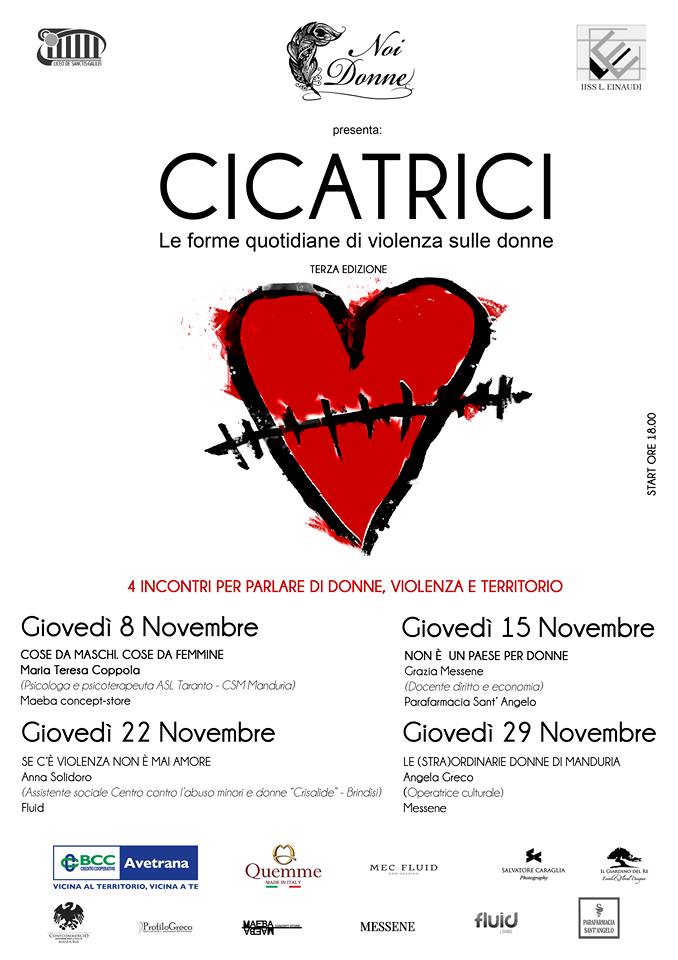 Giovedì 15 novembre Grazia Messene, docente Diritto ed Economia, si soffermerà sul tema “Non è un Paese per donne” presso la parafarmacia Sant’Angelo. Giovedì 22 novembre, Anna Solidoro, assistente sociale, relazionerà sul tema “Se c’è violenza non è mai amore” presso il bar Fluid. Infine giovedì 29 novembre l’operatrice culturale Angela Greco parlerà delle “Le (stra)ordinarie donne di Manduria” presso Messene.