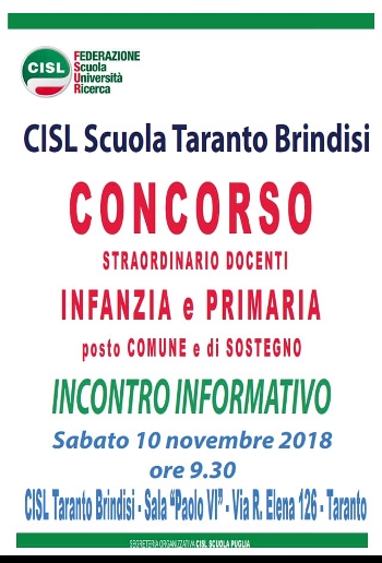 Si terranno domani a Taranto e Brindisi presso la sedi provinciali della CISL SCUOLA due incontri informativi per illustrare la procedura concorsuale straordinaria dei docenti di scuola primaria e infanzia