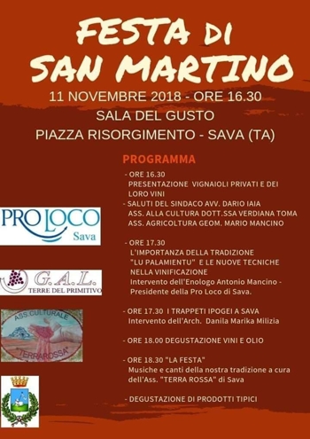 Dalle 16,30, per festeggiare San Martino e il vino novello 2018 al meglio, Pro Loco Sava ha pensato ad un pomeriggio all'insegna di profumi e degustazioni! Non mancheranno nuove scoperte del nostro territorio savese, grazie all’intervento Danila Marika Milizia, momenti di festa e musica popolare tradizionale a cura dell’ass. culturale Terra Rossa di Sava e tanto altro ancora che la Pro Loco Sava ha preparato!