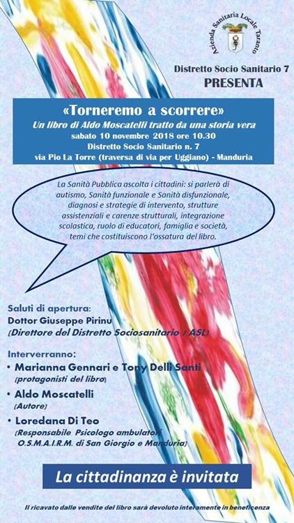 Presenzieranno la psicologa Loredana Di Teo (Osmairm di Manduria), Marianna Gennari e Tony Delli Santi (protagonisti del libro), Aldo Moscatelli (scrittore).