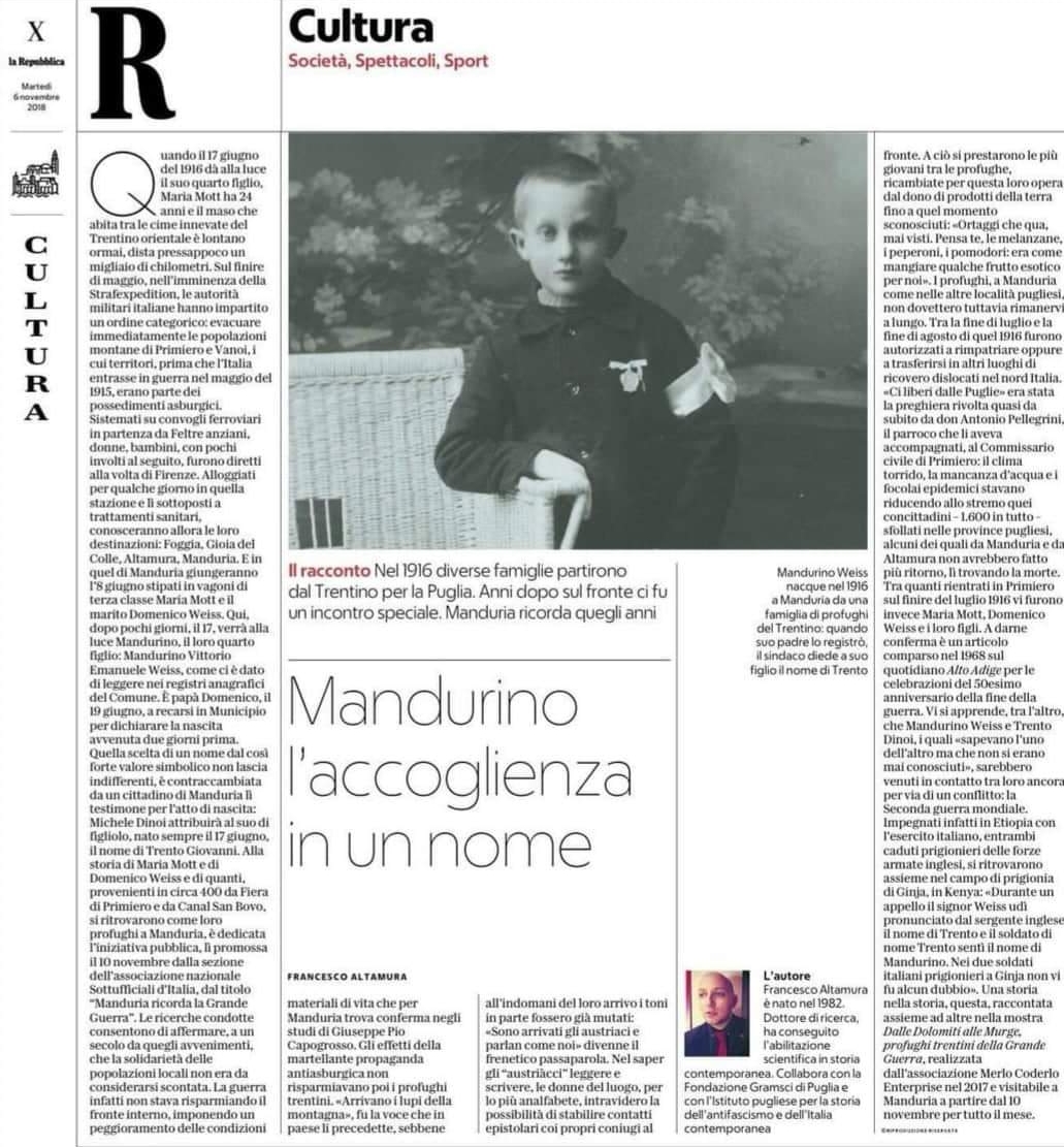 E’ firmato dal docente universitario Francesco Altamura, che domani interverrà al convegno sulla presenza dei profughi trentini a Manduria durante la Prima Guerra Mondiale, promosso dalla sezione di Manduria dell’ANSI
