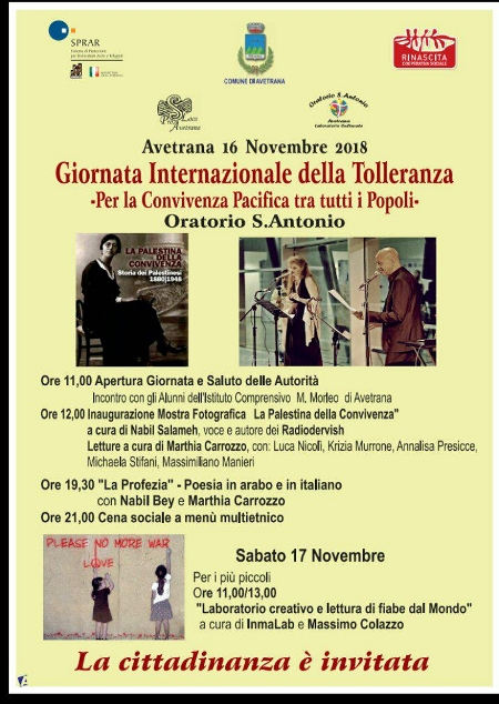 Anche Avetrana aderisce alla Giornata Internazionale della Tolleranza per il rispetto fra tutti gli uomini: da oggi e sino a domenica, saranno diverse le iniziative messe in campo dalla Pro Loco di Avetrana in collaborazione con il Comune di Avetrana e l’oratorio “Sant’Antonio”. L’ospite d’onore sarà Nabil Salameh, voce e autore del gruppo musicale Radiodervish, che oggi incontrerà i ragazzi della scuola avetranese e, poi, alle 21, parteciperà ad una cena sociale a menu multietnico, che si svolgerà nell’oratorio “Sant’Antonio”.