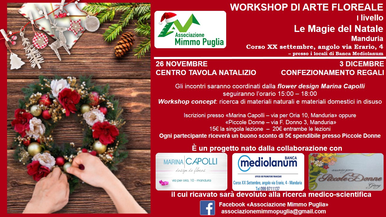Partirà lunedi prossimo, 26 novembre, il primo dei due incontri del “Workshop di arte floreale – Le Magie del Natale”, organizzato e promosso dall’associazione “Mimmo Puglia”, in collaborazione con Marina Capolli Design de Flores, Banca Mediolanum e Associazione Piccole donne. Due incontri coordinati dalla flower designer Marina Capolli, in cui ogni partecipante potrà mettere in moto la propria creatività elaborando un centro tavola o delle confezioni regalo utilizzando materiali naturali o materiali domestici in disuso. Gli incontri (26 novembre e 3 dicembre) si terranno presso i locali di Banca Mediolanum in via XX settembre, ed ogni partecipante riceverà un buono sconto spendibile presso Piccole Donne, a Manduria.