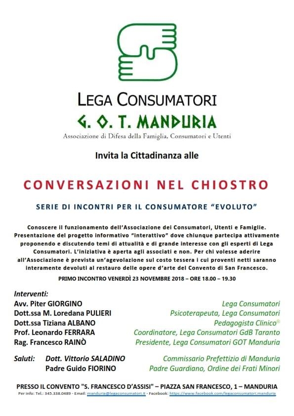 Una originale iniziativa del G.O.T. di Lega Consumatori Manduria si avvierà alle ore 18 di venerdì 23 novembre 2018 presso il salone del convento San Francesco d’Assisi in Manduria.