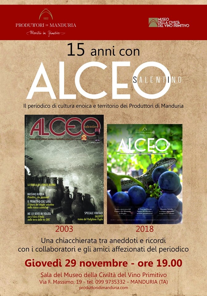 Questa sera, alle ore 19, presso la sala del Museo della Civiltà del Vino Primitivo, saranno celebrati i 15 anni di ALCEO Salentino (2003/2018 ) con una chiacchierata tra collaboratori ed amici del periodico.