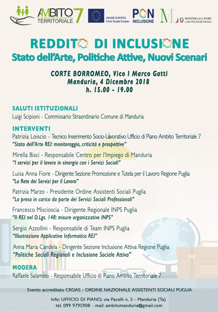 Nell’ambito del progetto REI, prima misura nazionale di contrasto alla povertà, l’Ambito Territoriale sta organizzando, il prossimo 4 dicembre, a Manduria, il seminario “REI: Stato dell’Arte, Politiche Attive, Nuovi Scenari”.