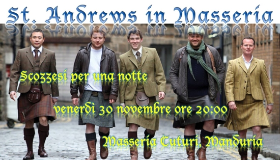 Musica dal vivo, danzatori da tutta Italia che coinvolgono il pubblico, ristorazione con cibi tradizionali scozzesi e col vino prodotto dalla stessa masseria, sono gli “ingredienti” con cui si vuole celebrare Sant’Andrea, patrono della Scozia, all’insegna del motto “Scozzesi per una notte”