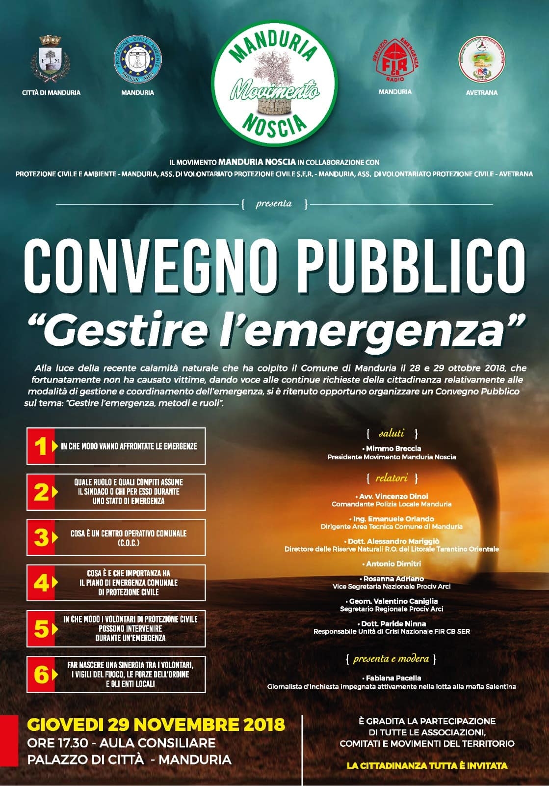 Ad un mese esatto dalla recente calamità naturale che ha colpito Manduria, il movimento “Manduria Noscia” (in collaborazione con il Gruppo Volontari Protezione Civile e Ambiente Manduria Provic-Arci, Protezione Civile Radio C.B. Manduria, Protezione Civile Avetrana) dando voce alle continue richieste della cittadinanza relativamente alle modalità di gestione e coordinamento dell’emergenza, ha ritenuto opportuno organizzare un convegno pubblico sul tema “Gestire l’emergenza”.