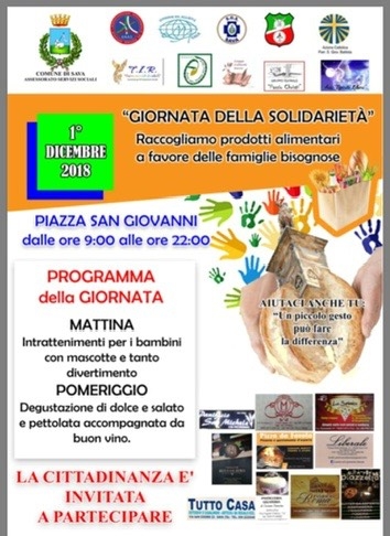 In un’ottica di integrazione delle forze in campo, l’Amministrazione comunale di Sava, in collaborazione con le associazioni di volontariato, promuovono la Giornata della Solidarietà che si terrà questa sera (sabato) in piazza San Giovanni.