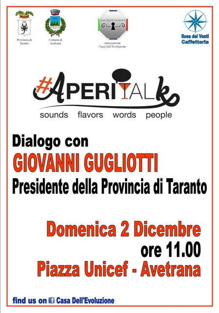 Il primo appuntamento degli AperiTalk si terrà questa mattina (domenica 2 dicembre), alle ore 11 e si svolgerà in piazza Unicef, con la collaborazione de La Rosa Dei Venti – Caffetteria e il patrocinio dal Comune di Avetrana.