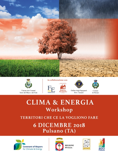 Giovedì 6 dicembre, dalle ore 9 alle ore 13, a Pulsano presso il Convento dei Frati Riformati, si terrà il workshop “Clima & Energia, le politiche per l’adattamento ai cambiamenti climatici e le sfide per la riduzione dei consumi energetici” dei Comuni dell’Unione delle Terre del Mare e del Sole L'incontro è organizzato dall'Unione dei Comuni “Terre del Mare e del Sole” in collaborazione con l’Associazione Borghi Autentici d'Italia, Federesco e l'Ordine degli Ingegneri di Taranto e con il Patrocinio di Regione Puglia, ANCI Nazionale ed ANCI Puglia.