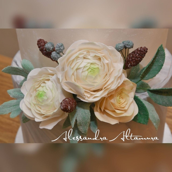 Tra il primo ed il secondo piano spicca una composizione floreale costituita da foglie e fiori realistici in flower paste, riproducente una coppia di ranuncoli bianchi ed una rosa. Il bouquet è arricchito con inserti di pigne e billy balls creati in pasta di zucchero da modelling. I petali, sono stati sfumati a pennello con colore a polvere e sulle foglie, nonché sugli inserti, è stato creato un effetto brina con polvere di wafer paper.