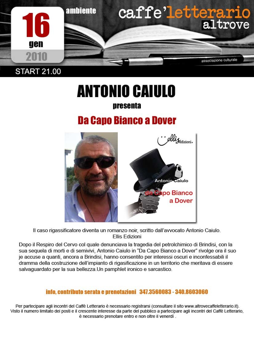piano), Antonio Caiulo, alle 21, presenterà “Da Capo Bianco a Dover”. Il caso rigassificatore diventa un romanzo noir, scritto dall’avvocato Antonio Caiulo e pubblicato da Ellis Edizioni.
