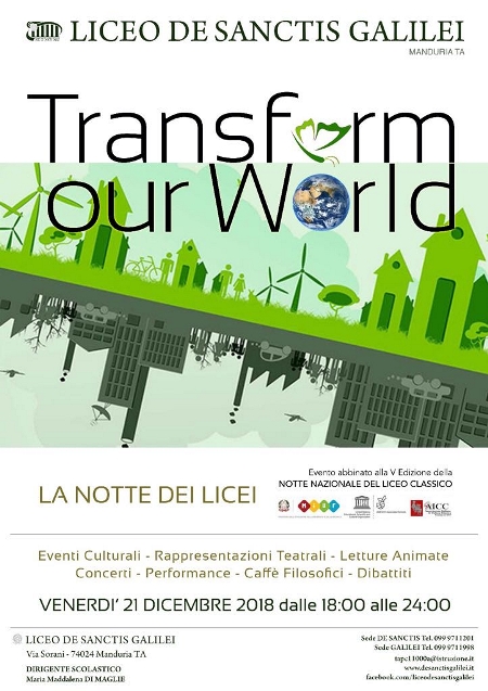 Nella condivisione di tali finalità, con l’obiettivo di testimoniare la dote, la bellezza e la vitalità del nostro patrimonio artistico-culturale, nonché di valorizzare il protagonismo degli studenti, i giovani liceali del “De Sanctis Galilei” accoglieranno i visitatori offrendo loro un ricco palinsesto di performace caratterizzanti del loro stessi indirizzo di studi, attraverso la realizzazione di un suggestivo percorso formativo, “Trasform our world”, ispirato al programma d’azione per le persone, il pianeta e la prosperità dell’Agenda 2030 per lo Sviluppo Sostenibile: esercizi di writing, attività di cosplaying con l’ausilio della multimedialità, presentazione di blog, illustrazione di ritratti viventi, racconti di un viaggio virtuale alla scoperta di feste e riti, mostra animata sulle donne dell’antica Roma, Caffè filosofico “Aut-aut”. Dopo le 20,00, nella cornice del teatro “De Santis”, sarà poi dato opportuno spazio alle esibizioni sceniche: dall’illustrazione animata e commentata dei quattro indirizzi di studio, “Le Muse dei licei”, a cura dell’hair stylist Luca Fontana; al Ted performance in lingua inglese e francese “La scienza nel dibattito culturale del Settecento”; per passare attraverso la pièce teatrale sul disagio della diversità, “Le declinazioni di genere”; e concludere con una messainscena sul tema dell’educazione alla vita emotiva dal titolo “E credo nell’Amore…”. Alle 22,00 fino al termine della serata, l’atmosfera si riscalderà ulteriormente grazie alle imperdibili note delle band musicali studentesche, che daranno vita al consueto “De Sanctis – Galilei Live Concert”.