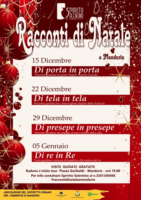 “Racconti di Natale a Manduria” questo il titolo di una serie di percorsi guidata tra le vie della città messapica, alla scoperta delle chiese, dei presepi, delle tradizioni più particolari e soprattutto tipiche e uniche solo di Manduria che si terranno tutti i sabati dal 15 dicembre al 5 gennaio. Le visite guidate gratuite sono state pensate per valorizzare percorsi legati al Natale, ma che raccontano in maniera completa la storia di una città, attraverso le sue tele, le sue porte, i suoi presepi storici.