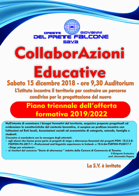 Avverrà domani, presso l’auditorium del plesso centrale “Del Prete”, la presentazione del piano triennale dell’offerta formativa dell’istituto “Del Prete-Falcone”. L’istituto incontra dunque il territorio per costruire un percorso condiviso per la progettazione del nuovo piano dell’offerta formativa.