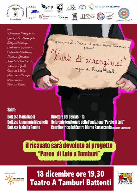 Alle ore 19.30 di oggi, martedì 18 dicembre, presso il Teatro “A Tamburi Battenti” della Chiesa di San Francesco De Geronimo di Taranto, andrà in scena “L’arte di arrangiarsi” per il “Parco di Lulù a Tamburi di Niccolò Fabi”; l’ingresso è libero e gratuito con una libera donazione a favore del progetto benefico promosso del noto cantante.
