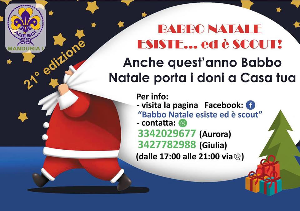 La tradizione si rinnova. Per il 21° anno consecutivo, il Gruppo Scout Agesci Manduria 1 propone il servizio della consegna dei regali per la vigilia di Natale. Babbo Natale e i suoi aiutanti elfi, vestiti di tutto punto, nel pomeriggio e nelle ore serali che precedono la festività del Natale passeranno di casa in casa a consegnare i regali direttamente nelle mani dei più piccoli.