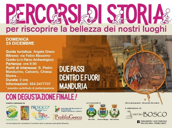 Domenica prossima, 23 dicembre, ultimo dei tre appuntamenti con la nostra mini rassegna “Percorsi di storia”: in programma un tour dentro e fuori il centro storico. Grazie alla maestria di Angela Greco, sarà possibile riScoprire scorci, vicoli e altri punti di interesse della bella cittadina, partendo dalla chiesa di San Pietro Mandurino.