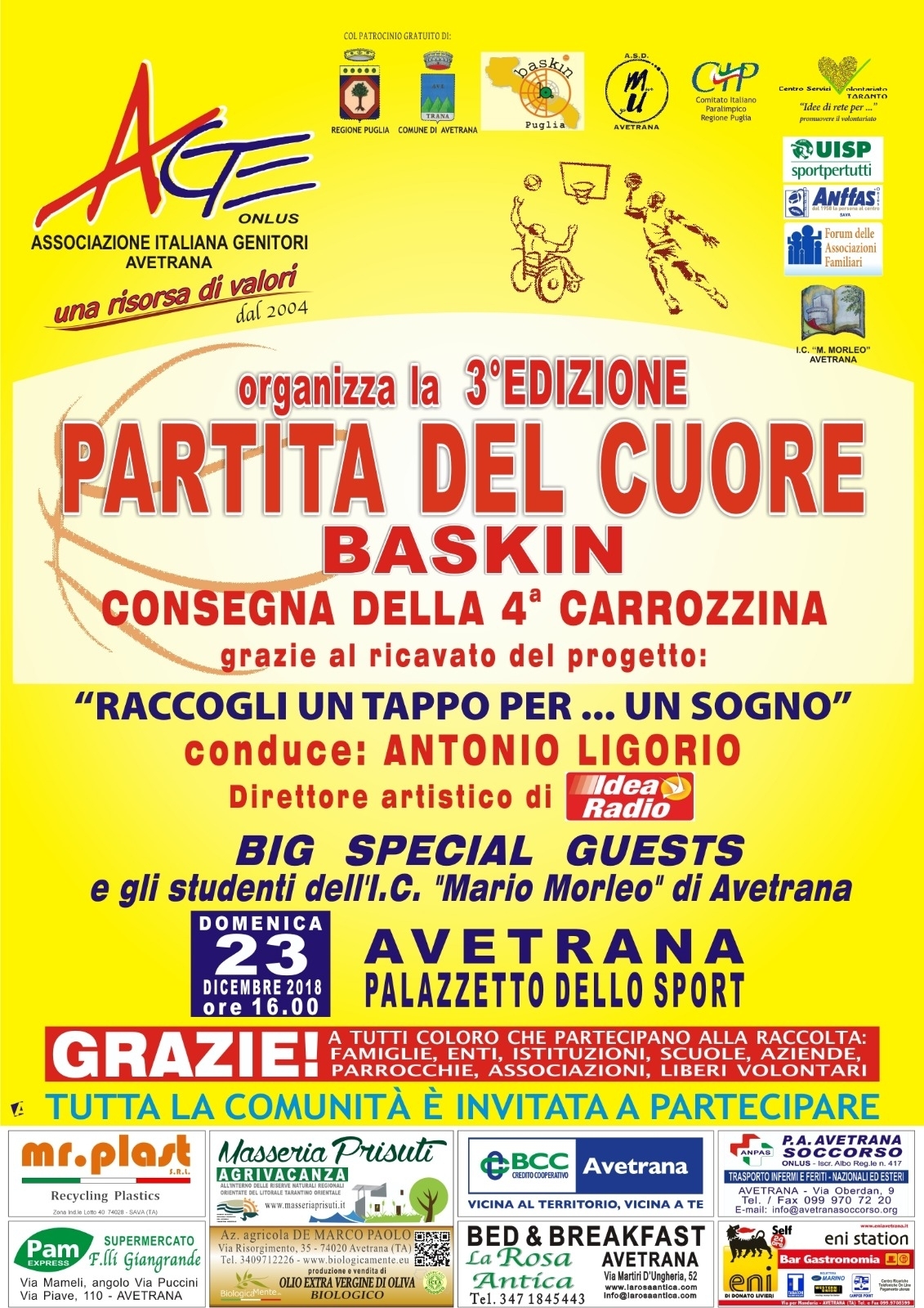 La “Partita del cuore” è un match di baskin che vedrà in campo giocatori con disabilità e non insieme agli studenti dell’I.C. “Mario Morleo” di Avetrana, primo istituto in Puglia ad attuare da anni, in orario curriculare, il Baskin; la manifestazione, condotta da Antonio Ligorio, direttore artistico di “Idea Radio”, gode del patrocinio morale di Regione Puglia, Comune di Avetrana e Comitato Paraolimpico Italiano Regione Puglia.