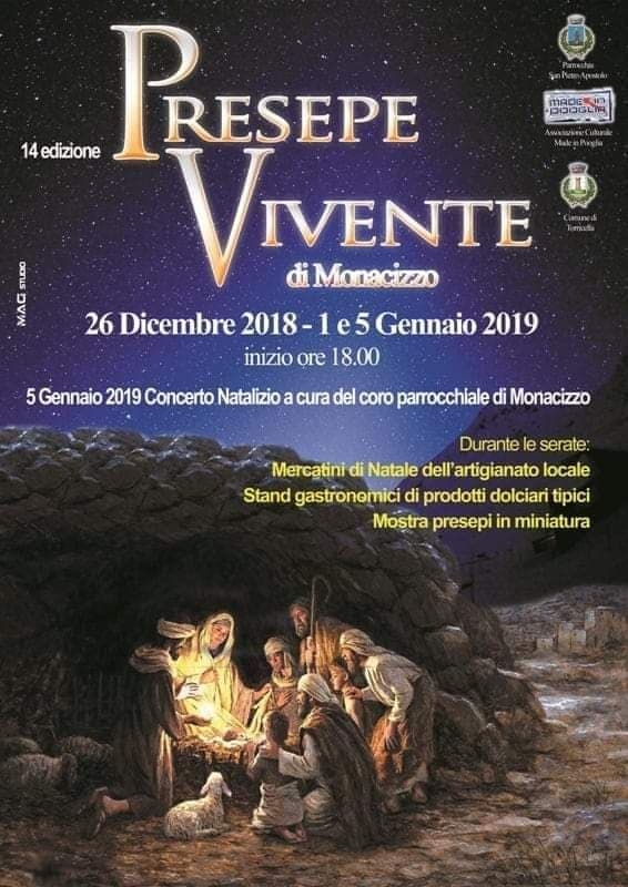 Nella serata del 26 dicembre alle 18:30 concerto di Natale a cura della orchestra di fiati e voce “Giacomo Puccini”, diretta da Alessandro Pichierri (replicheranno alle 19:30); nella serata del 5 gennaio 2019 concerto natalizio curato dal coro parrocchiale di Monacizzo diretto da Gianni D’Ippolito (alle 19).