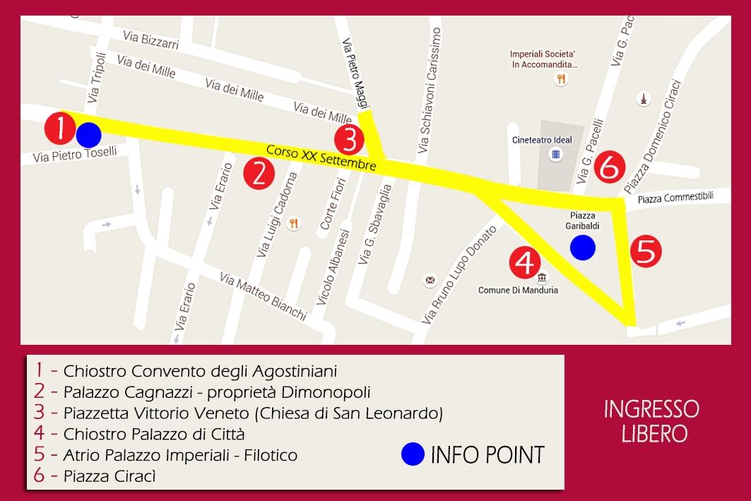 «Location dell’evento sarà il corso XX Settembre e due dei chiostri più suggestivi di Manduria che su di esso si affacciano, un’occasione per aprire questi splendidi contenitori al grande pubblico e per mettere in risalto tutto il valore del nostro patrimonio storico–artistico» afferma Domenico Sammarco, presidente della Pro Loco di Manduria. «Le settecentesche campate del chiostro degli Scolopi (palazzo di Città, in piazza Garibaldi) amplificheranno il pop-rock della cover rock band anni 70-80-90 Attahome e ospiteranno la street art di Matteo Pesare, mentre nell’ex convento degli Agostiniani risuonerà la musica dei talenti della Music Academy, oltre ad accendersi grazie ai colori delle tele di giovani artisti locali che esporranno le loro opere in una mostra patrocinata da Confcommercio Manduria. In piazzetta Vittorio Veneto (antistante la chiesa di San Leonardo), lo scenario ad alto contenuto folcloristico con esibizioni a base di musiche popolari sarà l’epicentro di questa festa natalizia, il cui clima verrà infuocato dalle note de “I Pizzicati dell’Einaudi”, a cura degli studenti del I.I.S.S. Einaudi di Manduria e del trio composto da Giuseppe Anglano, Biagio Mele e Floriana Guida.