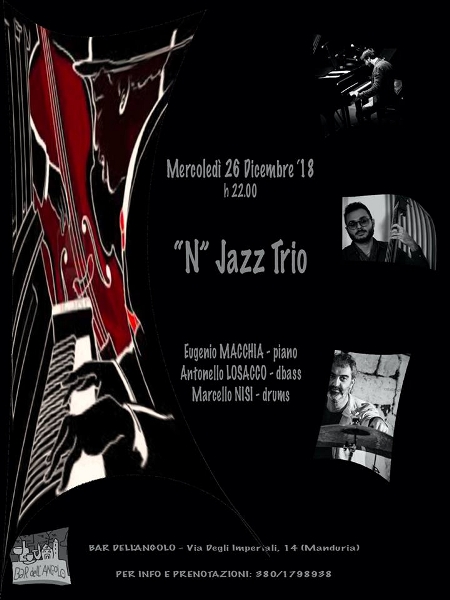 Un maliardo continuum fra tradizione e modernità, che nasce dall’idea di attingere dal prezioso e inesauribile patrimonio storico jazzistico come punto di partenza, per poi intraprendere direzioni stilistiche che si incardinano su un’impronta estremamente moderna. Mercoledì 26 dicembre, ore 22, “N” Jazz Trio, nuova e interessante formazione costituita da Eugenio Macchia (pianoforte), Antonello Losacco (contrabbasso) e Marcello Nisi (batteria), terrà un concerto al Bar dell’Angolo di Carmelo Massafra (Via degli Imperiali, 14 – Manduria).