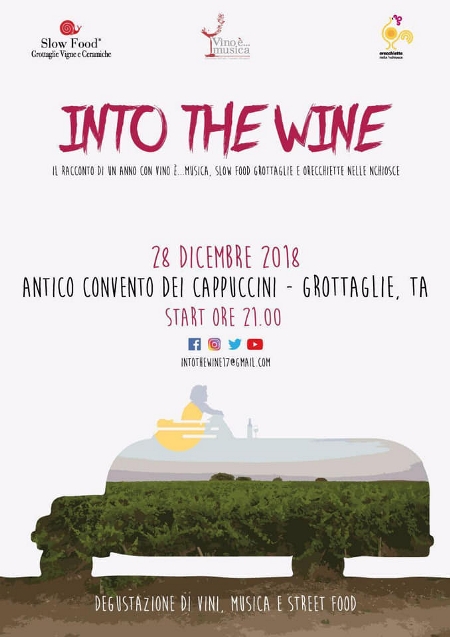 “Into the wine” è il racconto del viaggio, intorno alle eccellenze del nostro Sud che le tre associazioni organizzatrici dell’evento, Intersezioni (Vino è Musica), Slow Food Grottaglie Vigne e Ceramiche e Orecchiette nelle ‘nchiosce , hanno realizzato in un anno tra degustazioni, eventi e convegni legati all’enogastronomia.