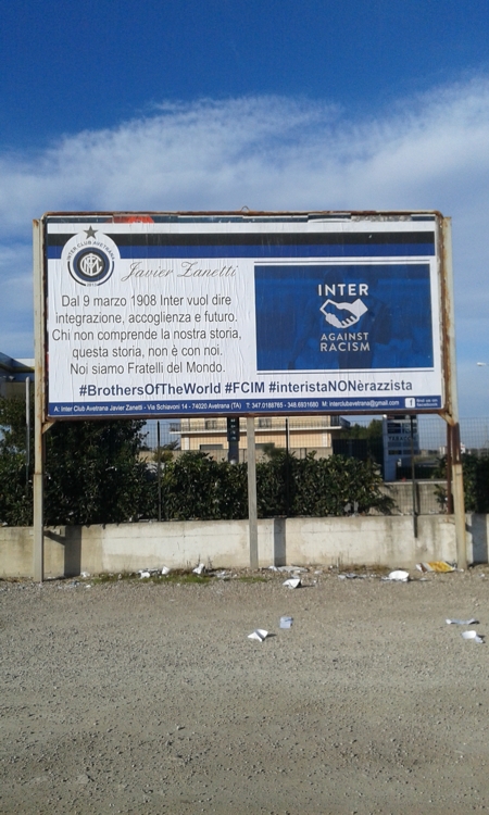 A seguito degli indecorosi cori razzisti lanciati dagli spalti di S. Siro la sera del 26 dicembre, durante la gara di campionato Inter-Napoli, contro il difensore partenopeo Koulibaly, l’Inter Club “J. Zanetti” di Avetrana ha voluto prendere una posizione netta e forte. Su proposta del presidente Giacomo Carrozzo e del responsabile Relazioni Esterne Salvatore Luigi Baldari, infatti, il sodalizio avetranese ha fatto affiggere un manifesto 6x3, lungo la direttrice per Manduria, che parla chiaro: “Dal 9 Marzo 1908 Inter significa integrazione, accoglienza e futuro. Chi non comprende la nostra storia, questa storia, non è con noi. Noi siamo Fratelli del Mondo. Interista non è razzista”.