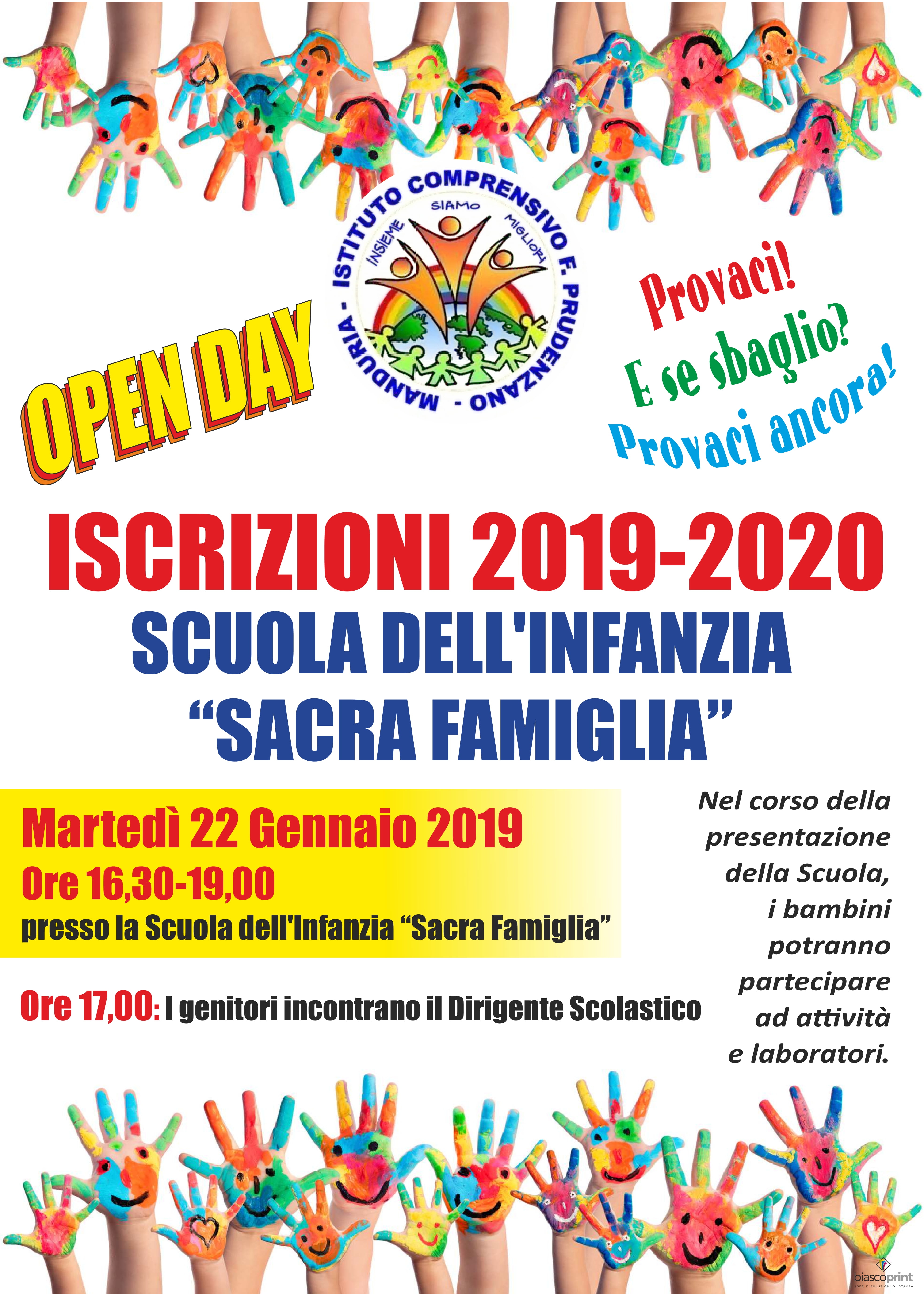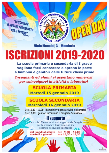 L’istituto comprensivo “Francesco Prudenzano”, come si vede anche dai manifesti, ha già ufficializzato le proprie date: il 15 gennaio l’open day per la scuola primaria, il 16 per la scuola secondaria di primo grado e il 22 per la scuola dell’infanzia.