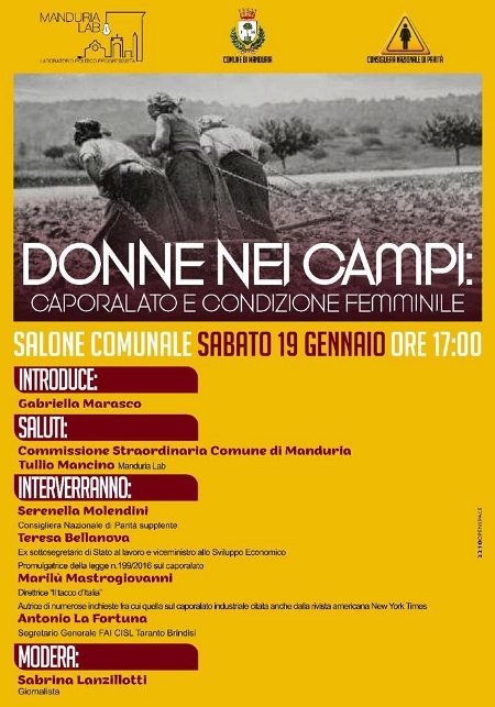 Il “caporalato” come una delle tante forme di violenza sulle donne: sarà questo il tema che Manduria Lab offre alla riflessione e all’ approfondimento nell’incontro “Donne nei Campi” che si terrà a Manduria questa sera (sabato 19 gennaio), alle ore 17, presso la sala consiliare.