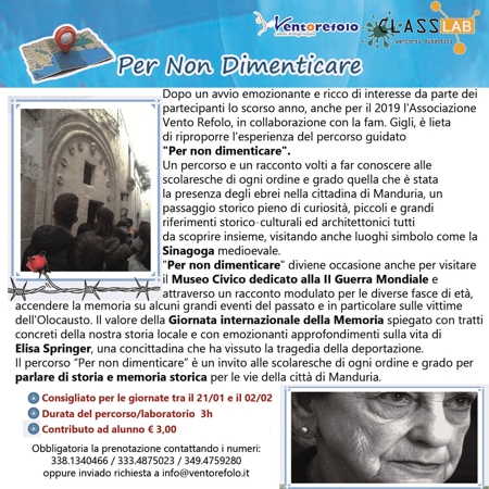 Da oggi (lunedì 21 gennaio) fino al 2 febbraio, l’associazione Vento Refolo, nell’ambito del progetto didattico di promozione territoriale Class Lab, darà il via alle visite guidate di approfondimento storico dedicato alla Giornata Internazionale della Memoria, dal titolo “Per non dimenticare”. Attraverso questa iniziativa accoglierà nel centro storico di Manduria oltre 20 scolaresche che avranno modo di visitare il Ghetto Ebraico, di conoscere la storia degli Ebrei in Puglia, di vedere la Sinagoga antica (grazie alla collaborazione con la famiglia Gigli). Inoltre, il percorso guidato condurrà a vedere il Museo Civico di Manduria, con le sale dedicate all’ultimo conflitto mondiale, e quindi si avrà l’opportunità di conoscere la storia e la straordinaria testimonianza di Elisa Springer, vissuta per 50 anni nella città, ma di origine viennesi e sopravvissuta ai campi di sterminio tedeschi.