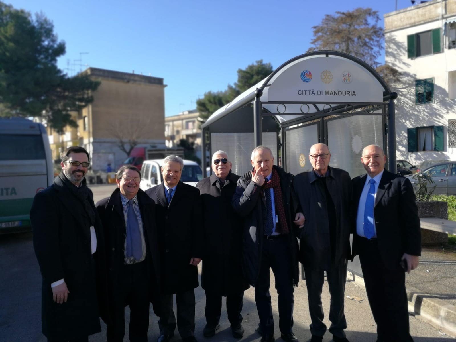 Il Rotary Club di Manduria ha donato alla città una pensilina, al cui interno potranno ripararsi, dalla pioggia nei mesi invernali o dal sole durante le giornate afose, i pendolari (studenti o lavoratori), che attendono i bus nel capolinea di via per Maruggio. Installata già da qualche settimana secondo le indicazioni del dirigente dell’Ufficio Tecnico del Comune di Manduria, l’ing. Emanuele Orlando, la pensilina è stata formalmente collaudata e quindi inaugurata nei giorni scorsi, dapprima con una cerimonia che si è svolta nell’aula consiliare e, quindi, con un sopralluogo nell’area della fermata delle autolinee lungo via per Maruggio. Cerimonia alla quale hanno preso parte, per il Comune di Manduria, il commissario straordinario Vittorio Saladino, e, per il Rotary Club, l’assistente del Governatore, Francesco De Geronimo, il presidente del club di Manduria del Rotary, William Nino Camassa, insieme a prefetto dello stesso sodalizio, Giuseppe Perrone e ad altri soci.